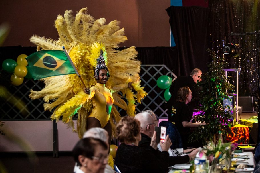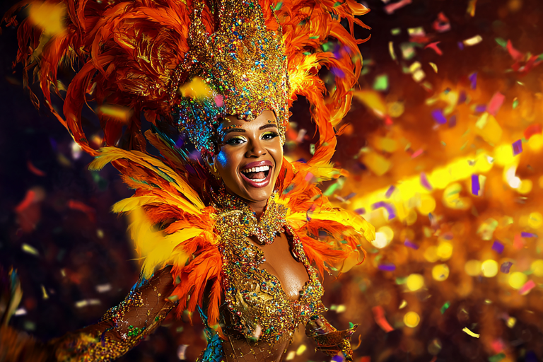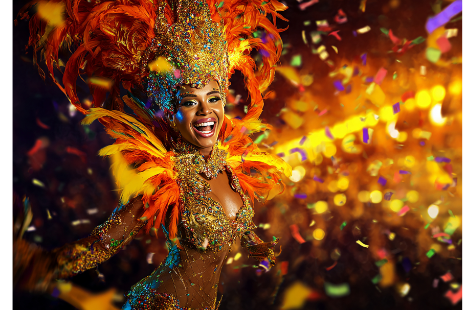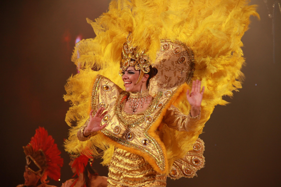 Ses costumes vous feront voyager á travers l’Océan Atlantique, avec ses originalités, ses plumes, ses couleurs extraordinaires remplis de paillettes.