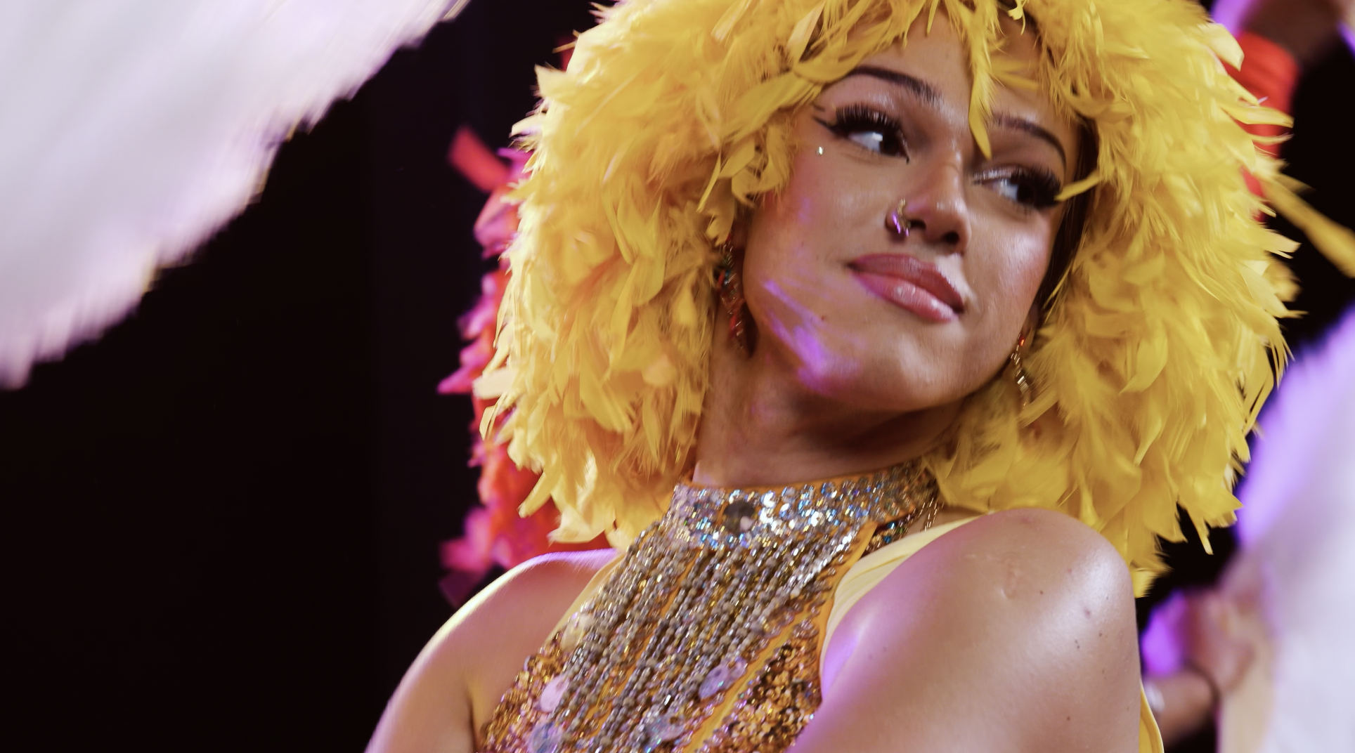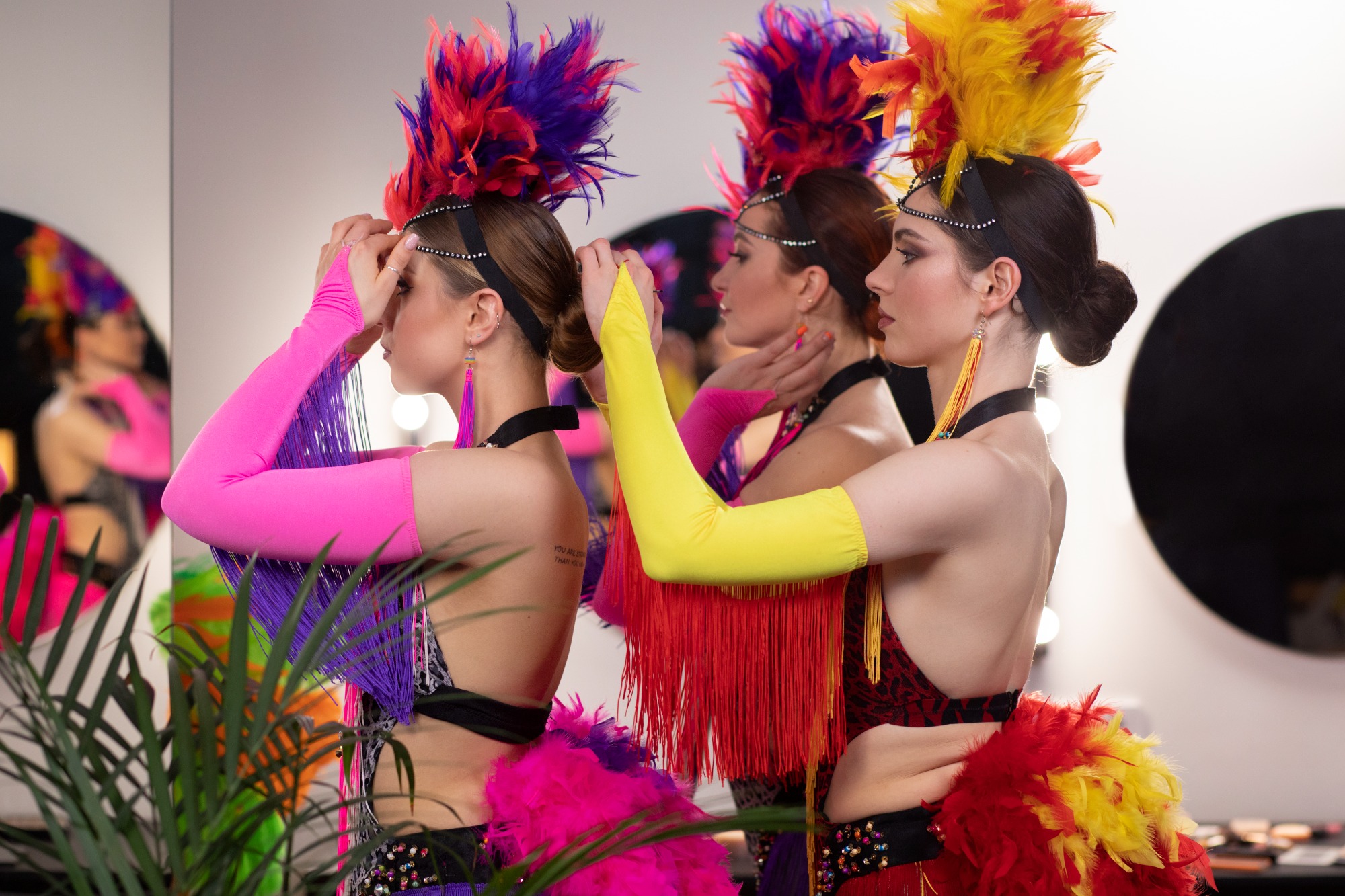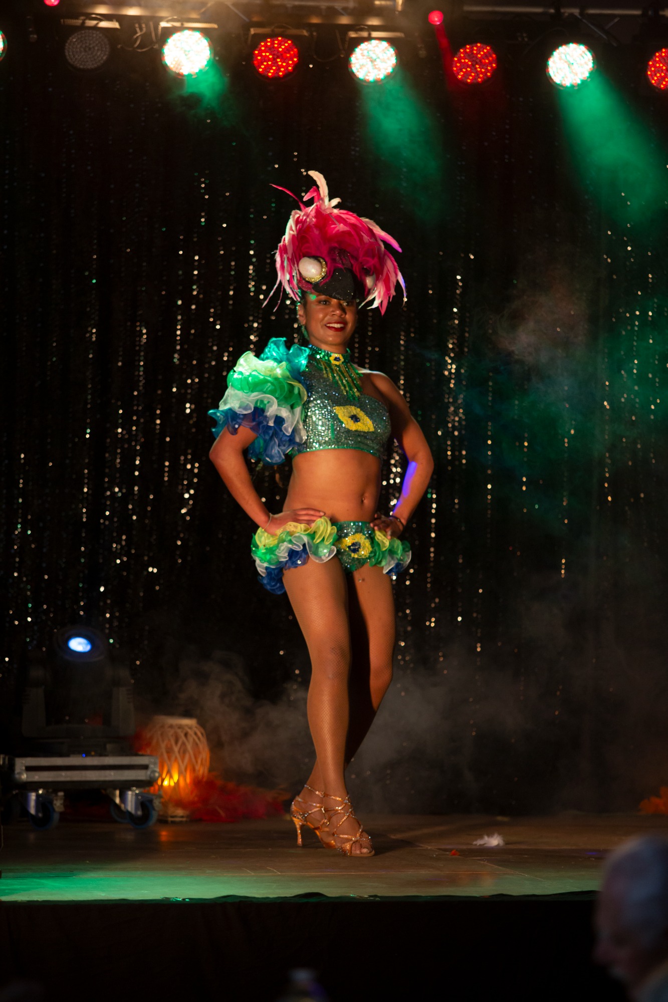 Ses costumes vous feront voyager á travers l’Océan Atlantique, avec ses originalités, ses plumes, ses couleurs extraordinaires remplis de paillettes.